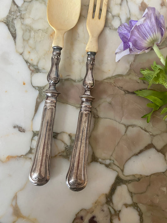 couverts à salade en corne et argent fourré